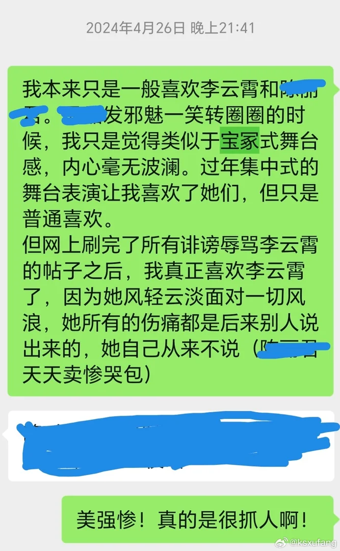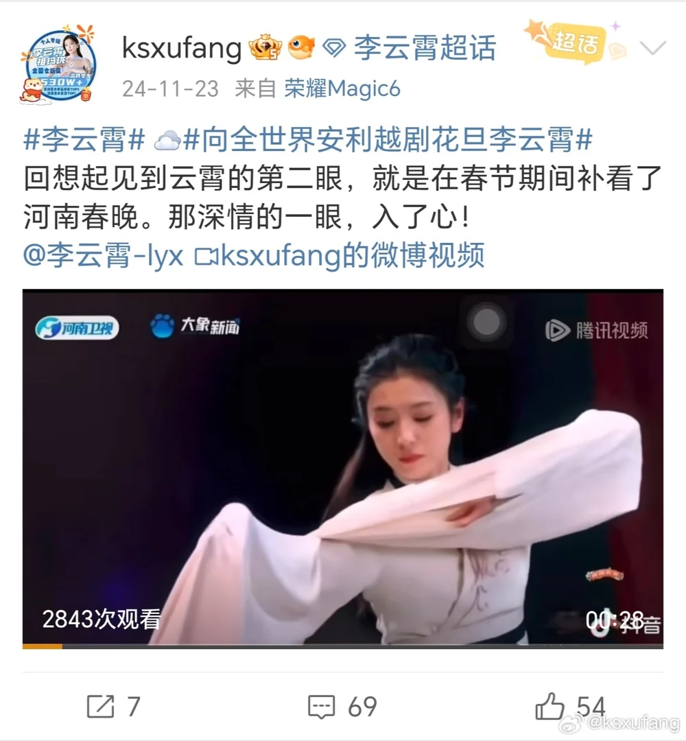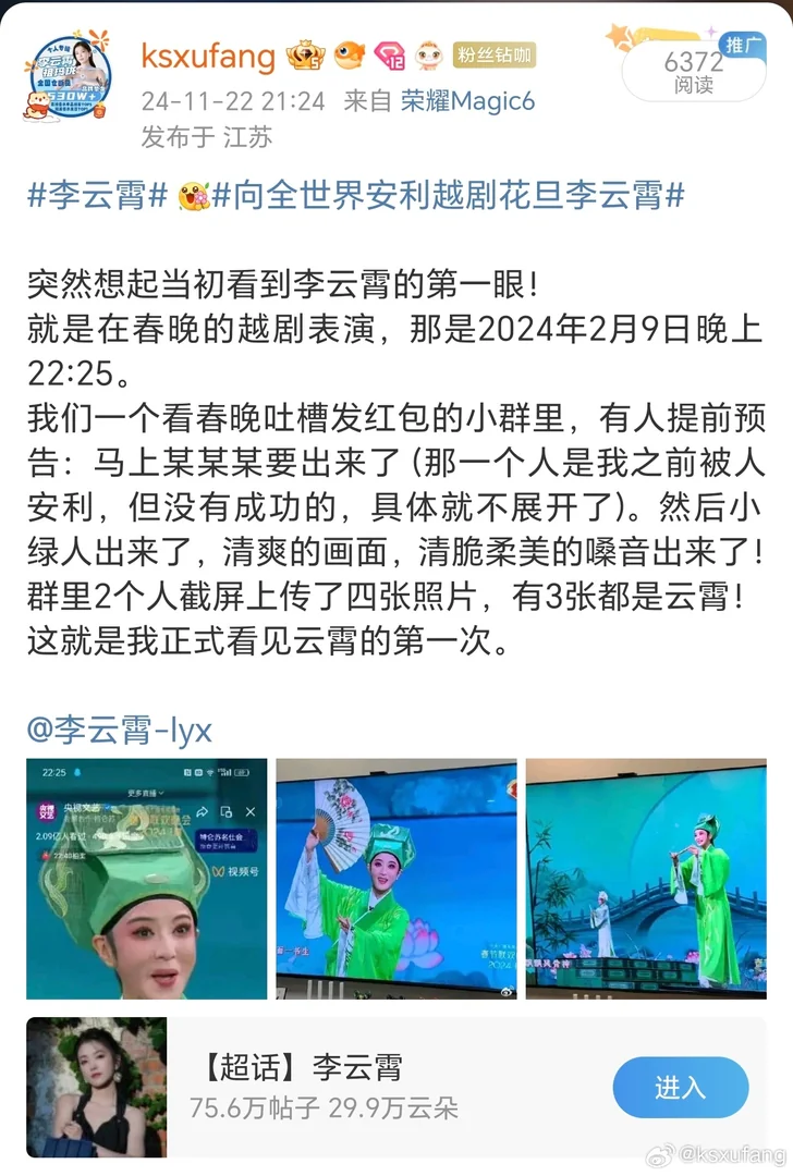 2024年除夕夜和朋友一起看并吐槽春晚,在朋友的引导下第一次认真看到了李云霄!之后春节假期中空闲,电视网络到处都看,越看越多,越看越想看,就开始主动搜索了,一开始有点饥不择食,只要与李云霄有关的我都看都关注,她说谁好我就给谁点赞,后来慢慢才知道她心太善良了,然后又慢慢做减法,慢慢才稳定在云超住下来了……