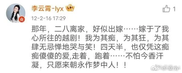 👉“我为其痴,为其狂,为其肆无忌惮的哭与笑。”十几年的岁月年华,奉献给了越剧,那些在练功房里的日日夜夜,那些为热爱流下的点点滴滴泪水与汗水,那些排练演出时积累的伤痛疾病,全都是因为她的爱人-越剧!