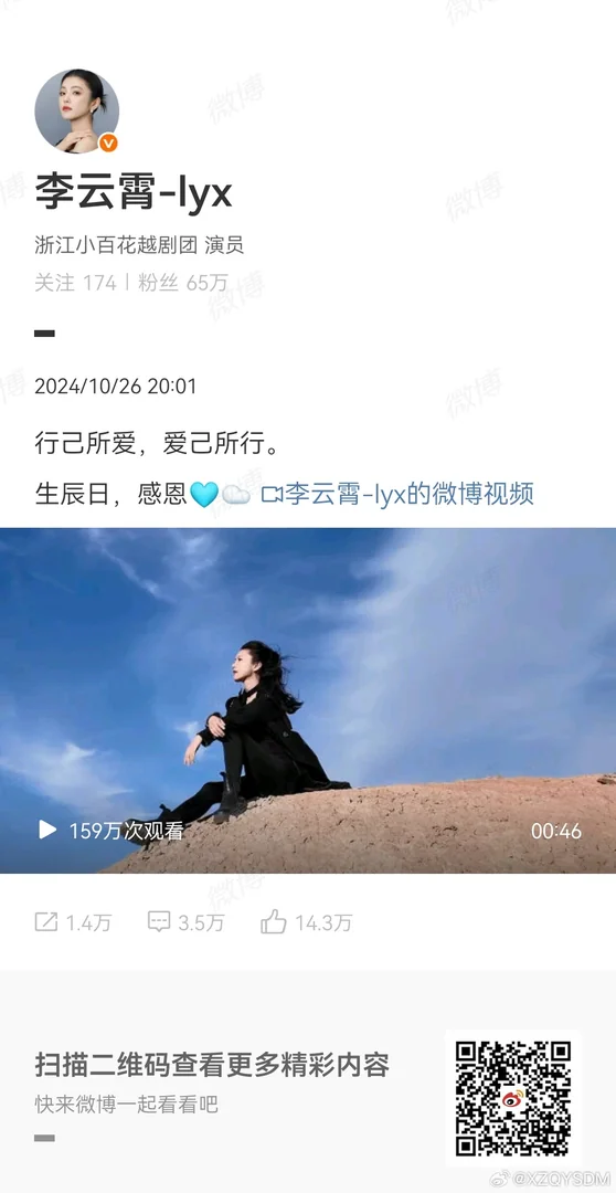 2024.10.26微博的“行己所爱,爱己所行”,第一次经历线上看一群人轰轰烈烈的给一个人准备生日,好多名词我都是第一次听说,一边为你开心一边百度学习,好像没有人期待你会发条状态(其实内心都是期待的吧,但是你开心才是最期待的事情),她们把期待给了生日博,在隐约推断出生日博也没有后,也有人等到两三点吧。当时的遗憾应该是有份生日礼物没能亲手送给你,但是没关系,我们还有很多其他的礼物。26号晚上你给了我们一份从天而降的礼物,这个视频我看了好多好多好多遍,张开双臂迎风奔跑的你,最后定格的水袖,让我开心又安心 [期待] [期待] [期待]