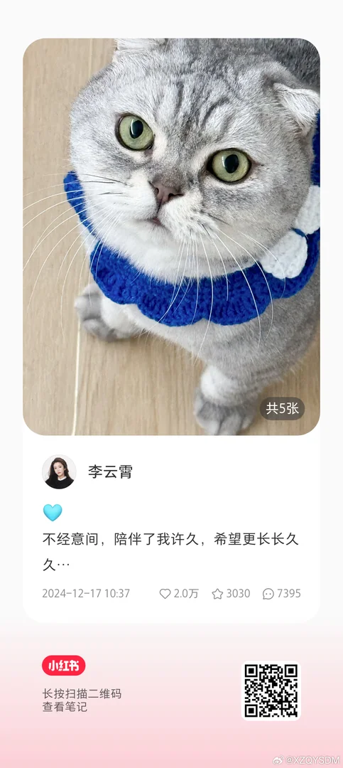 2024.12.17XHS“不经意间,陪伴了我许久,希望更长长久久”。我没有经历你命名云朵的日子,但我也当成了你对我说的情话。 [么么哒] [么么哒] [么么哒]
