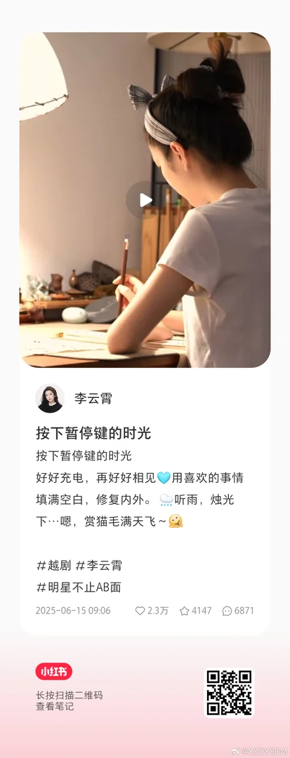 2025.6.15XHS“按下暂停键的时光”不能见面的那些日子你有好好充电,我们都在期待下一次好好相见。万分的心疼,在这一刻更心疼你,也知道这样的你,真的会爱很久很久 [给你小心心] [给你小心心] [给你小心心]