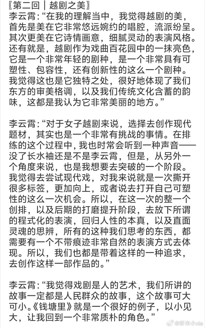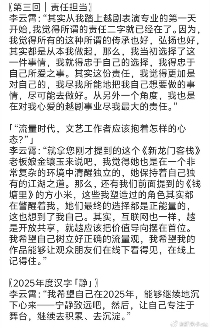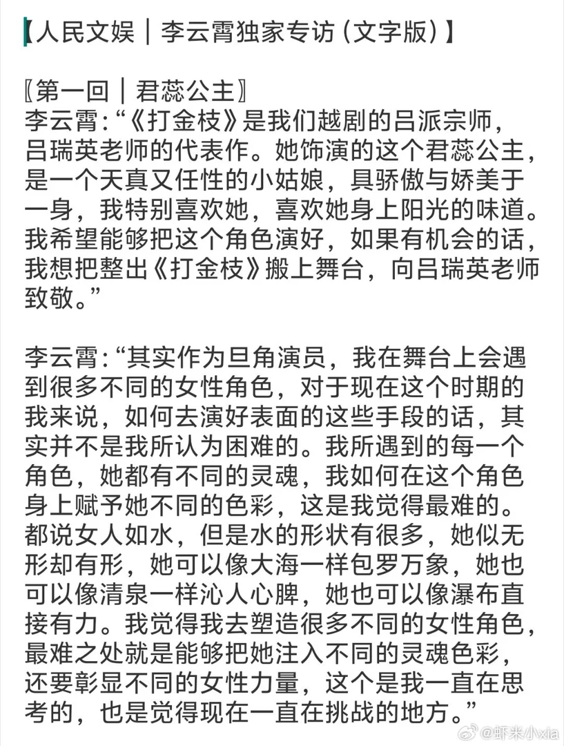 李云霄接受《人民文娱》的采访,在采访中展现了青年戏曲演员对传统艺术的深刻思考与创新探索,其观点兼具艺术深度与时代价值。